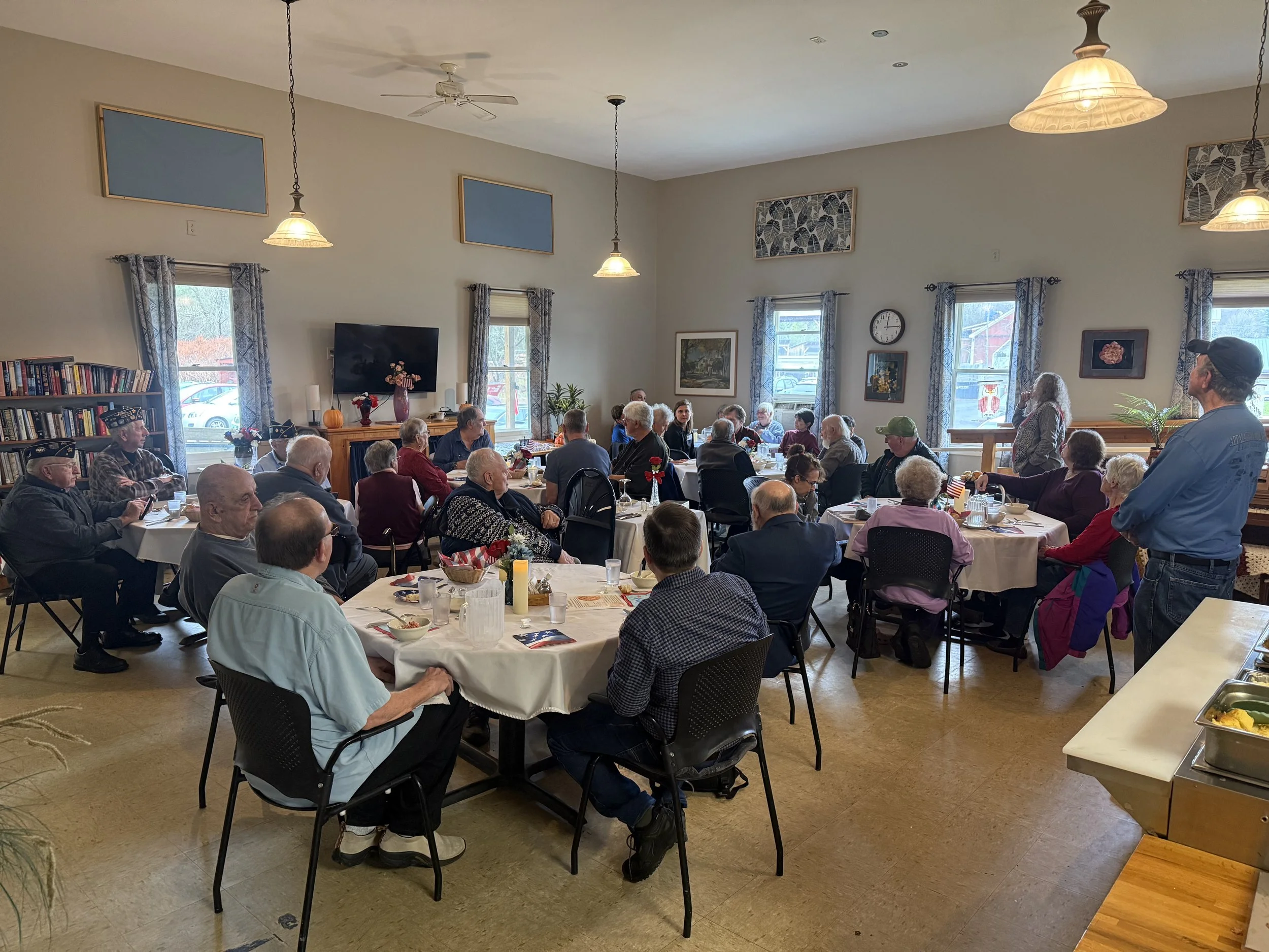 The TVSC dining room was packed with 35 diners, including 14 veterans who enjoyed a free lunch consisting of pulled pork, mac & cheese, baked beans, assorted veggies along with homemade rolls and pies, donated by The Wayside restaurant. Denise Wheeler, the TVSC Director, read a brief statement thanking our veterans for their service, courage and sacrifice. Lots of fun and laughter enjoyed by those present!!!