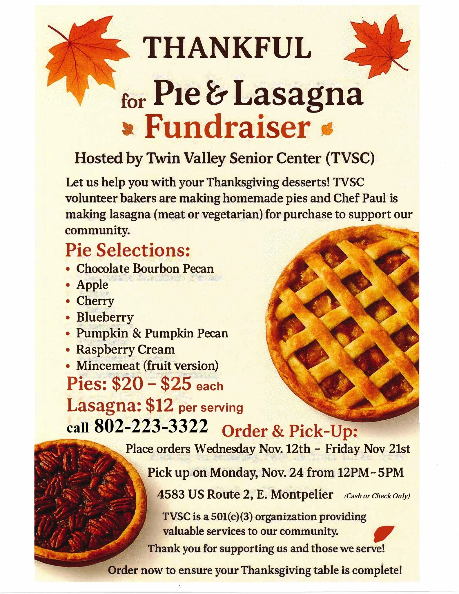 Thanksgiving Pie & Lasagna Sale!!! Place your orders November 12th-21st. Pickup will be on Monday the 24th from 12pm-4pm.